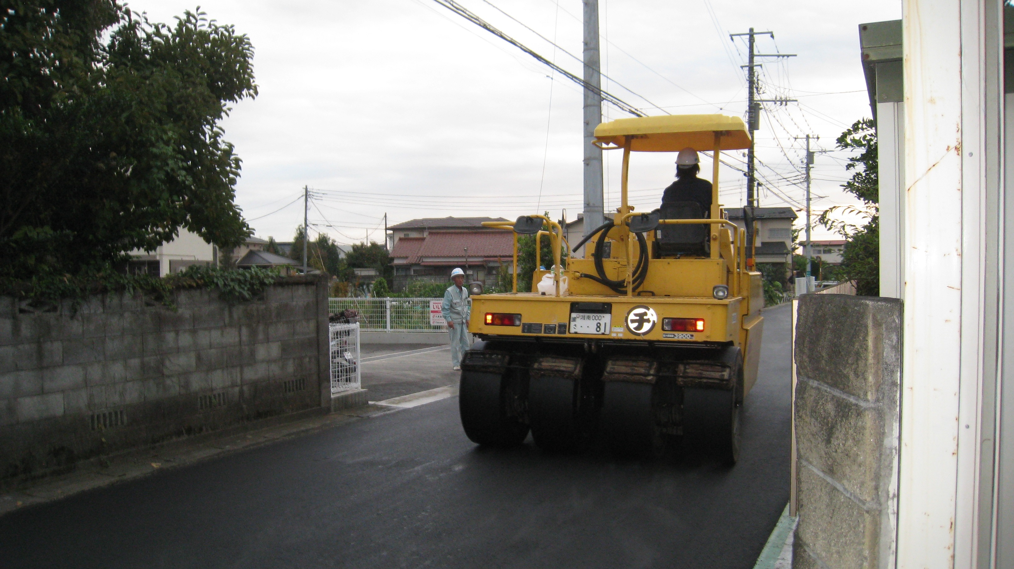 またマンホールや側溝との間など、細かな所は人海戦術ですが、その人の動きも正にスピーディーで手際よく、あれよあれよと見とれている内に舗装工事が完了しました。