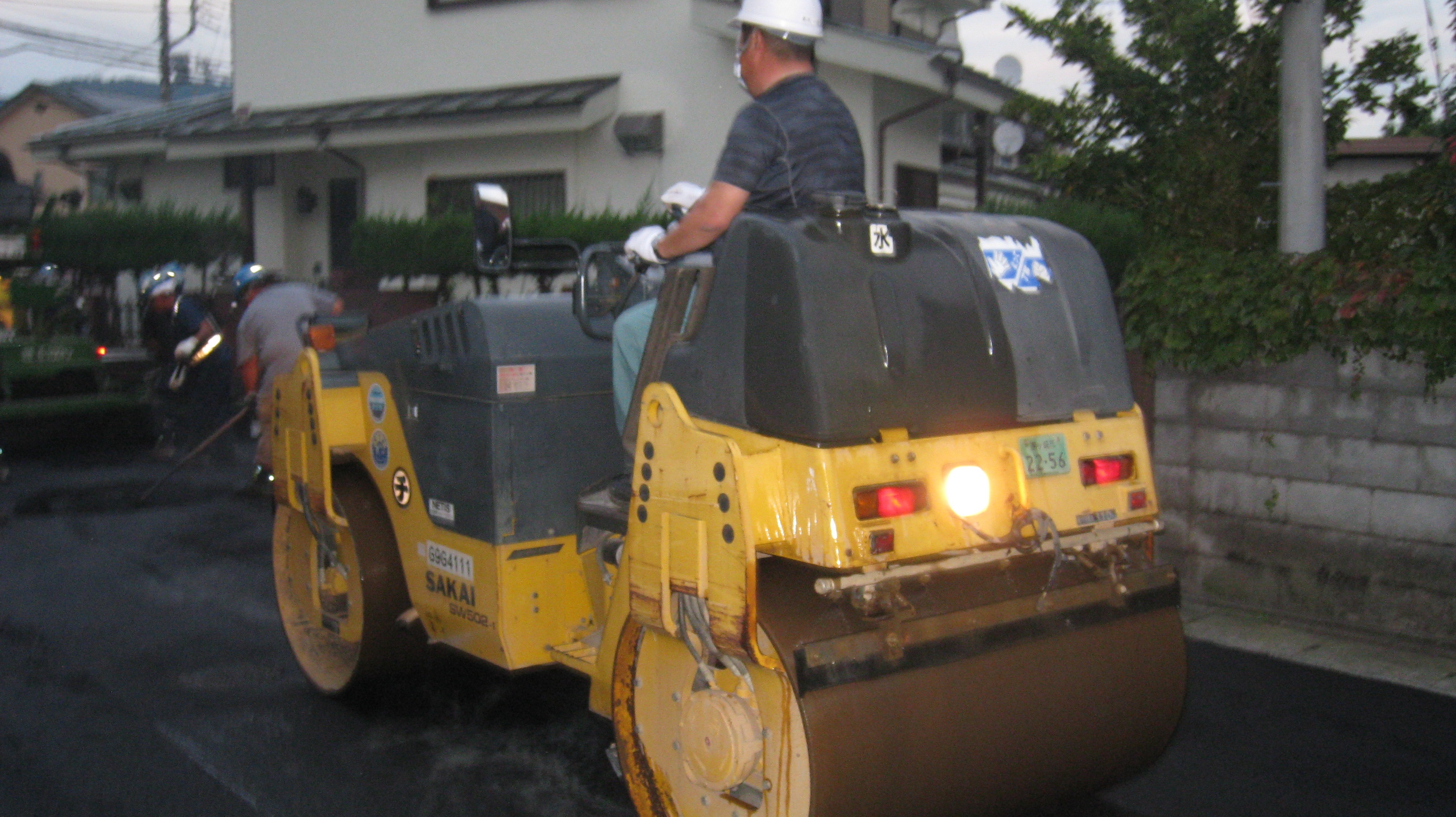 道路舗装用のアスファルトは150℃以上の温度で加熱処理されているため、素早い処理が不可欠のようですが、それにしても段取りと手際の良さに感心しました。